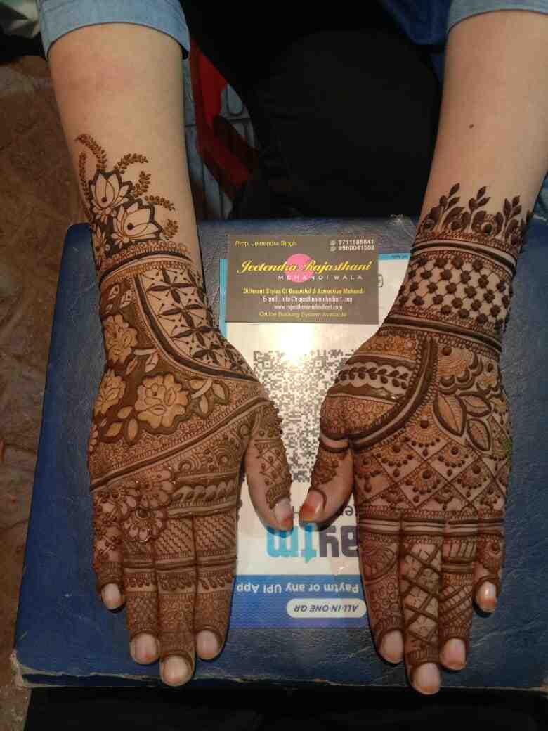 • Best Bridal Mehndi artist in delhi. Designs were amazing, color is super good. No chemical mixture. Natural herbal henna powder. I just loved their work. Rajsthani Mehndi Artist provided skilled service in the convenience of our own home, along with lovely designs at affordable rates. Definitely suggest. Monika Singh